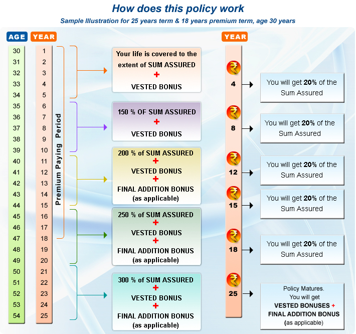 • Survival benefits are payable at regularintervals (see table below). Full sum assured is paid back by the end of the premium paying period.